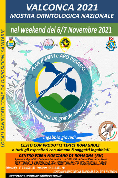 Dal 4 al 7 Novembre 2021, presso la Fiera di Morciano di Romagna (RN), si svolgeranno in un unico weekend l'edizione 2021 della mostra ornitologica nazionale Valconca e della specialistica più importante d'Europa per i fringillidi, Fringillia, organizzate dalle Associazioni Ornitologiche di Rimini e Pesaro.
